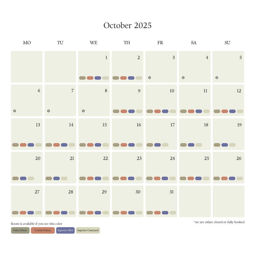 If your dates are at all flexible, please let us know. Please see our availabilities before booking a room. Rooms are available if you see a colour box inside your desired dates. If there is an * we are likely fully booked or closed for those dates. Minimum stay is 2 nights.